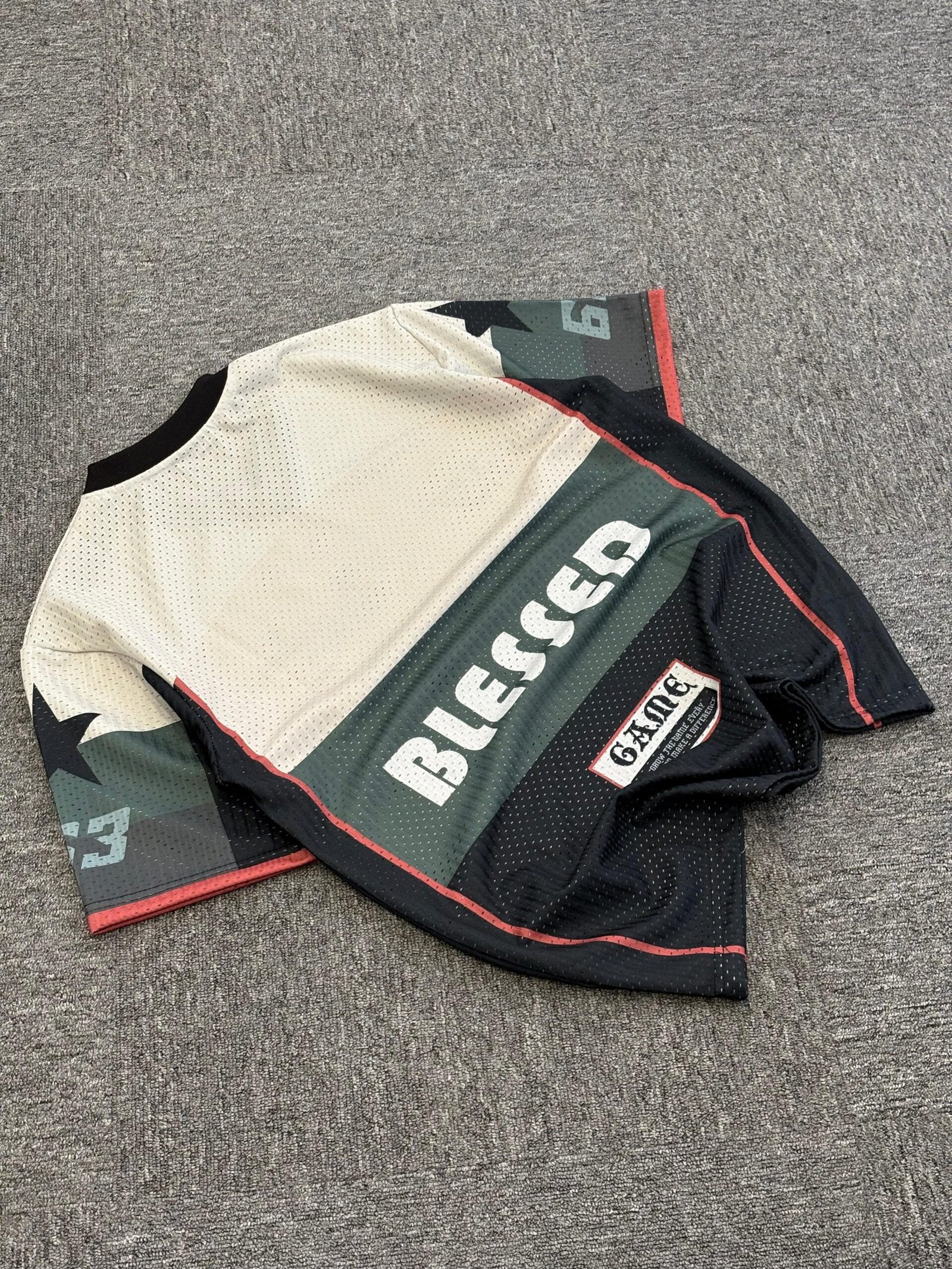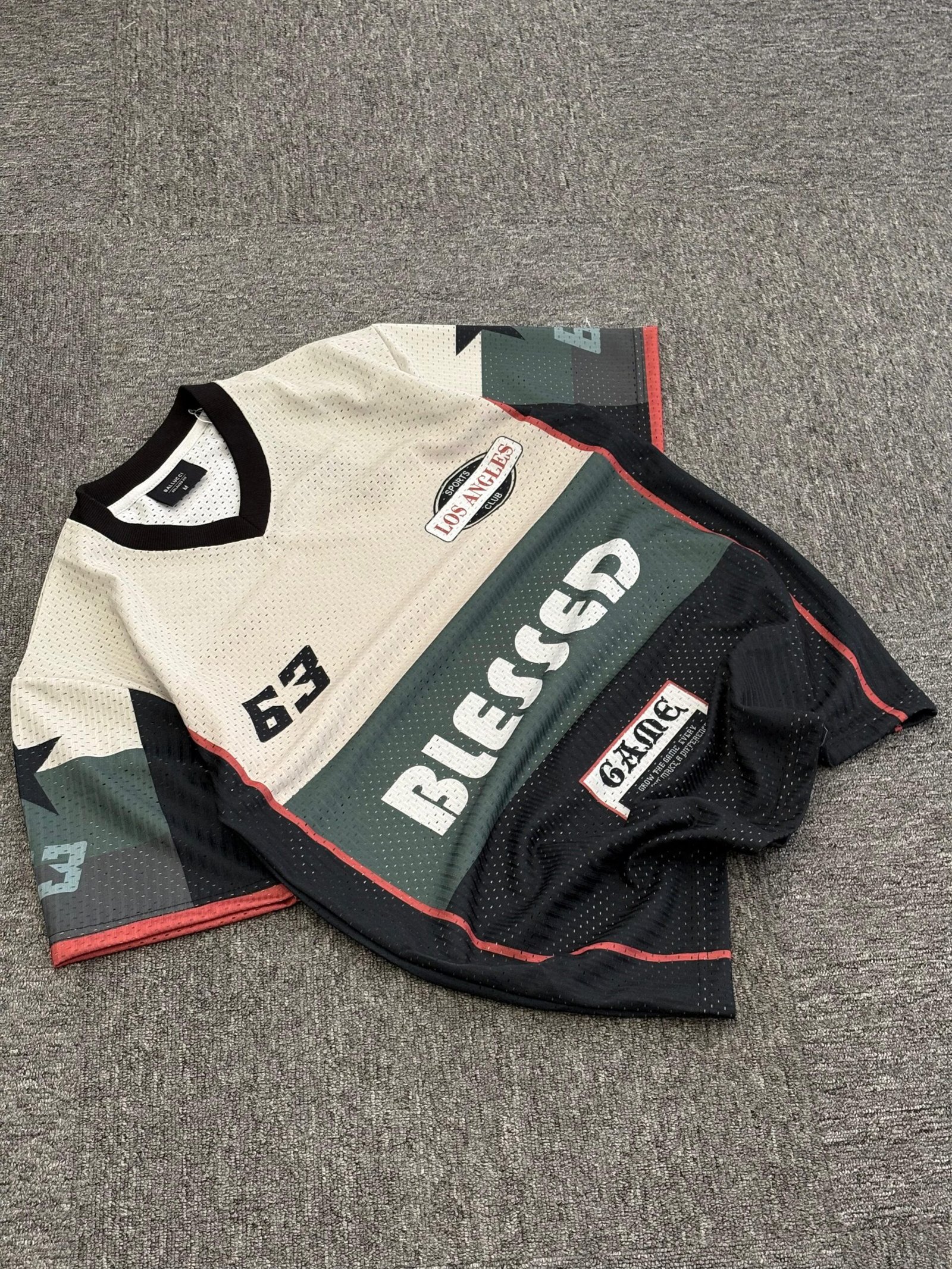 This beige and black mesh jersey combines a vintage sports look with West Coast flair. “Blessed” bold text and “Los Angeles” patches celebrate laid-back California vibes, while the “63” varsity number keeps it classic. A relaxed fit for easy everyday style.