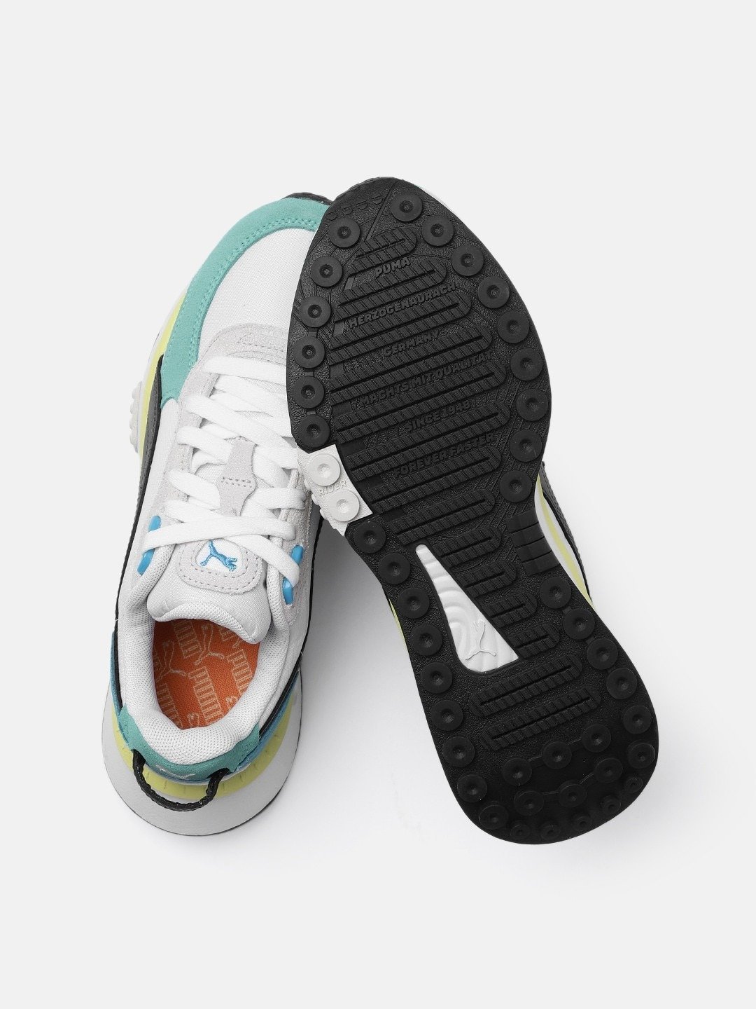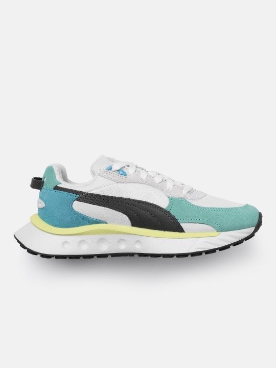 Crafted with a mix of premium suede overlays and breathable mesh panels, the upper provides style, structure, and all-day ventilation. The bold color-blocking in white, teal green, and soft yellow adds an energetic vibe that instantly elevates any outfit.